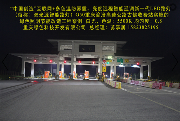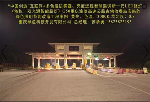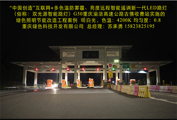 我司在G50重慶渝涪高速公路古佛收費(fèi)站實(shí)施的“中國創(chuàng)造”互聯(lián)網(wǎng)+多色溫防霧霾LED全智能路燈綠色照明節(jié)能改造工程,使用的“中國創(chuàng)造”互聯(lián)網(wǎng)+多色溫防霧霾LED全智能路燈及智能管理系統(tǒng),其具備多項(xiàng)特點(diǎn):(一)通過PM2.5、溫度、光敏、色溫、超聲波雷達(dá)等傳感器、高清攝像頭自動(dòng)采集智慧城市所需的環(huán)保、氣象、交通、安防等公共數(shù)據(jù)信息,通過“云平臺(tái)”實(shí)現(xiàn)共享,并利用智慧城市網(wǎng)絡(luò)、LED彩屏、微信、短信等信息平臺(tái),向社會(huì)免費(fèi)提供各類信息及Wifi等服務(wù)。(二)在不同氣候和季節(jié),可根據(jù)人們的感官需求及環(huán)境氣候的變化,通過溫度、濕度、PM2.5等傳感器遠(yuǎn)程智能調(diào)控?zé)艟叩纳珳?、亮度,?shí)現(xiàn)多種色溫、亮度舒適安全照明。遠(yuǎn)程智能控制系統(tǒng)自動(dòng)采集照明環(huán)境溫度、雨、霧、霾、雪、沙塵等數(shù)據(jù),智能將燈光色溫精細(xì)化調(diào)節(jié)到最舒適、最安全的照明值。在雨、霧、霾、雪、沙塵暴等惡劣天氣下,通過遠(yuǎn)程智能控制系統(tǒng)(包括手機(jī)APP)調(diào)控?zé)艄庹彰魃珳?,使用穿透能力?qiáng)的黃光(3000K色溫)照明,有效保障了在雨、霧、霾、雪、沙塵暴天氣下城市路燈安全照明和行車安全;在正常天氣下,根據(jù)環(huán)境溫度將燈光色溫智能調(diào)控為最舒適照明狀態(tài)。(三)根據(jù)不同時(shí)間段、光照度、車流量等情況,分別通過光敏、超聲波、雷達(dá)等傳感器智能調(diào)控?zé)艟?,?shí)現(xiàn)多種亮度燈光照明模式。可在不同時(shí)段將燈光智能調(diào)整為“白天”、“夜間”、“夏季”、“冬季”、“防霧霾”等多種照明模式,從而極大提高節(jié)電率,同時(shí)有效解決隧道照明為了節(jié)電普遍采用的關(guān)閉控制回路或者間隔關(guān)燈方式而造成照明暗區(qū),存在交通安全隱患的問題,實(shí)現(xiàn)無暗區(qū)的二次節(jié)能和安全、舒適照明,確保行車安全。(四)路面亮度均勻度、照度均勻度、節(jié)能率等重要參數(shù)均優(yōu)于LED路燈國家標(biāo)準(zhǔn)?;ヂ?lián)網(wǎng)+多色溫防霧霾LED全智能路燈一盞可當(dāng)多盞普通單色溫LED路燈使用,性價(jià)比更高,可提高光效10%,延長燈具使用壽命一倍以上。智能調(diào)色、調(diào)光,確保照明更加舒適、安全、節(jié)能。
